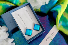 Az üveg mérete: 1,5 x 1,5 cm, a fülbevaló teljes hossza az üvegrésszel együtt 6 cm.