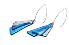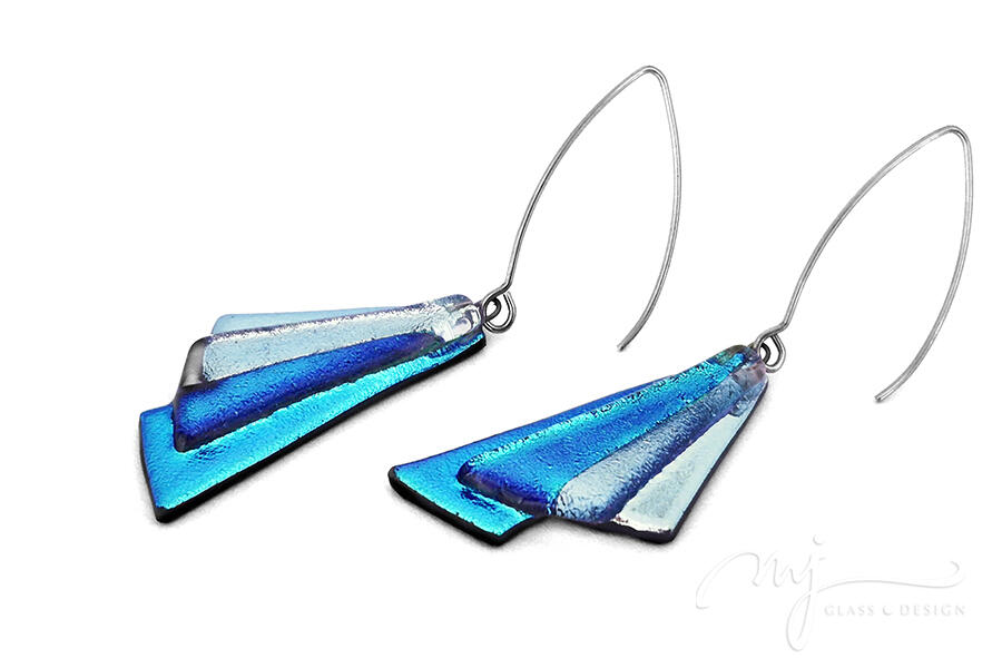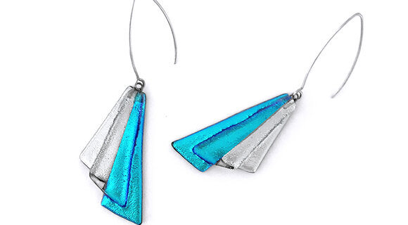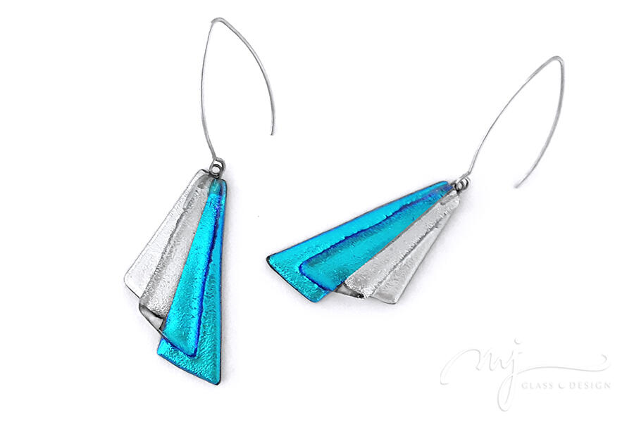 A fülbevaló gyönyörű színkombinációjához ezüstös és élénk türkizkék üvegeket választottam, mindezt legyező formára alakítottam. Irizáló felületükön azúrkék és indigókék árnyaltok is feltűnnek.