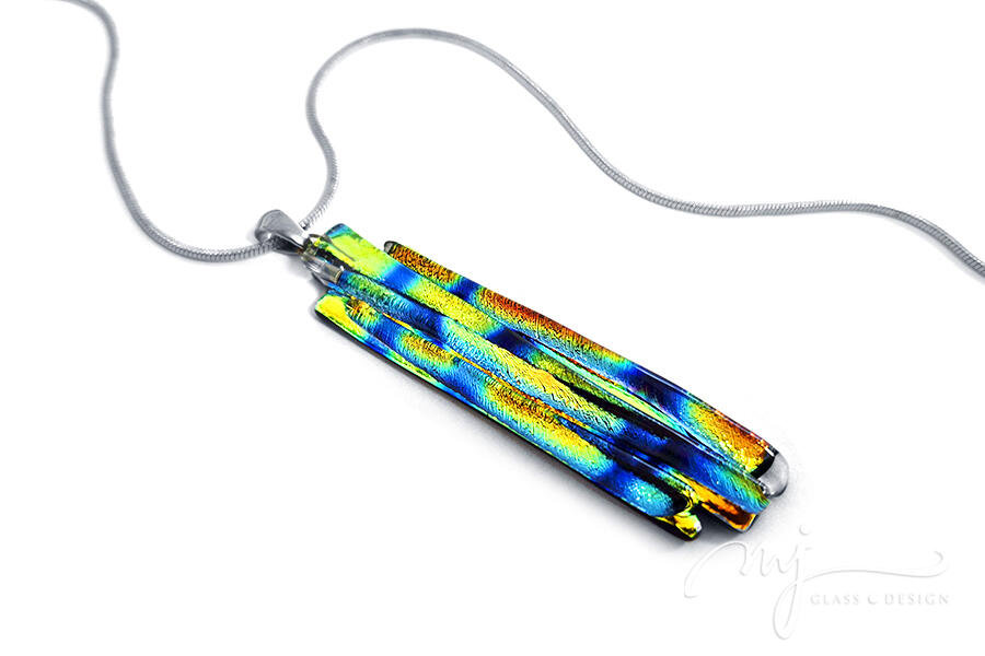 Fényes, élénk tónusokkal telt, cirmos mintázatú narancs, királykék, citromsárga és türkiz színekben játszó üveget olvasztottam téglalap alakzatra, amelyben némi indigókék árnyalat is megbújik. Az üvegmedált egy 50 cm hosszú, orvosi fém kígyóláncra fűztem fel, amelyhez kb. 4 cm-es hosszabbítóláncot is tartozik.
