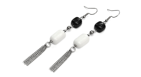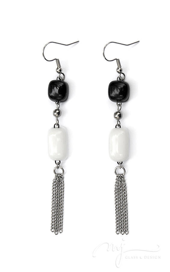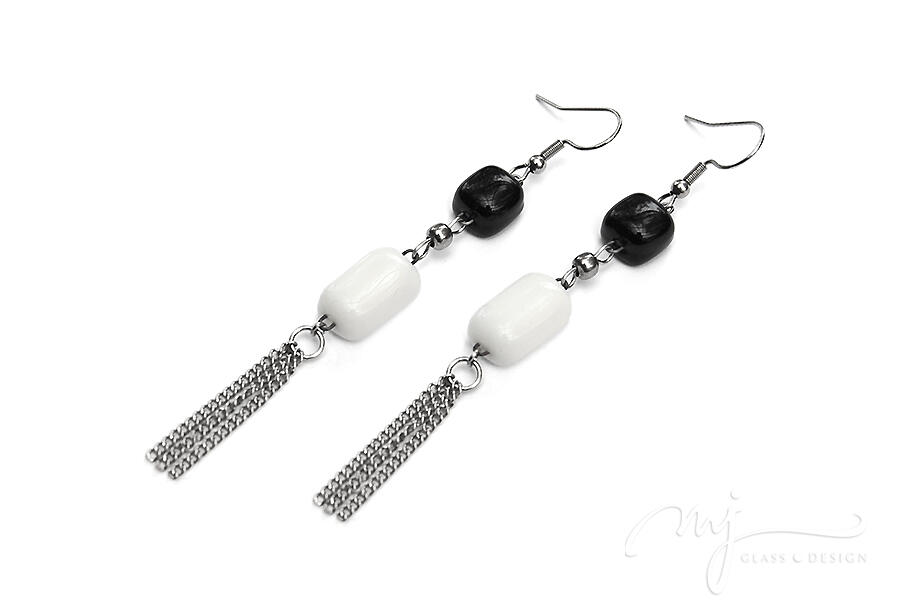 Fekete és fehér üvegelemekből állítottam össze ezt a lógós fülbevalót. Az üvegdarabokat apró gömbdísszel választottam el egymástól, az alsó elemre függesztett lánccsokor pedig remekül kiegészíti az amúgy is játékosan felépített formát.