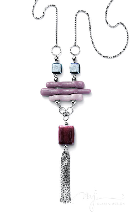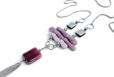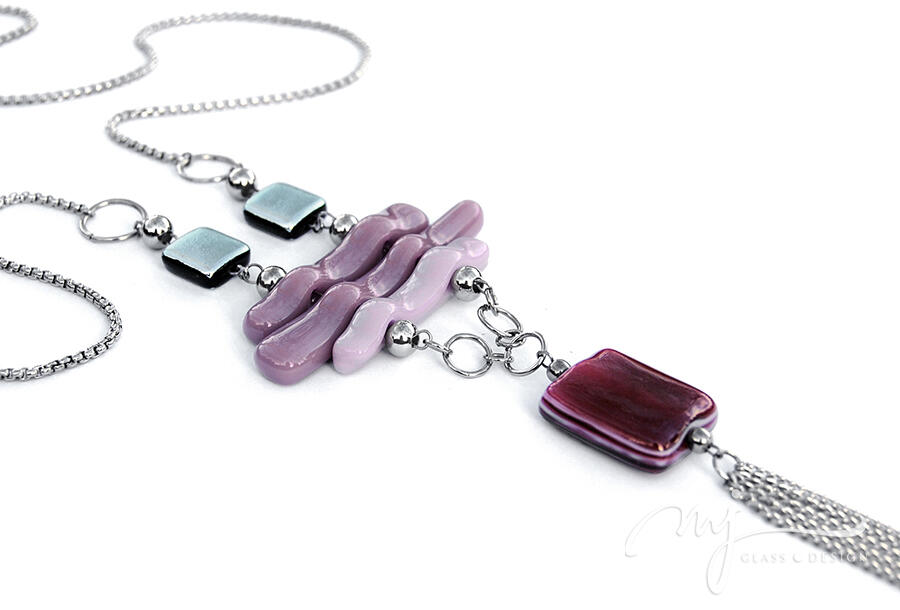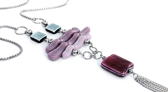 Matt fáradtlila, mályva és irizáló ezüst üvegelemekből állítottam össze a méreteiben és színeiben is harmonizáló medált. Az üvegelemeket gömbdíszekkel és különböző méretű fémkarikákkal választottam el egymástól, így építve fel a medált, aminek elemei hol fixek, hol játékosan forognak viselés közben, mindig egy újabb arcát mutatva meg így a világnak.