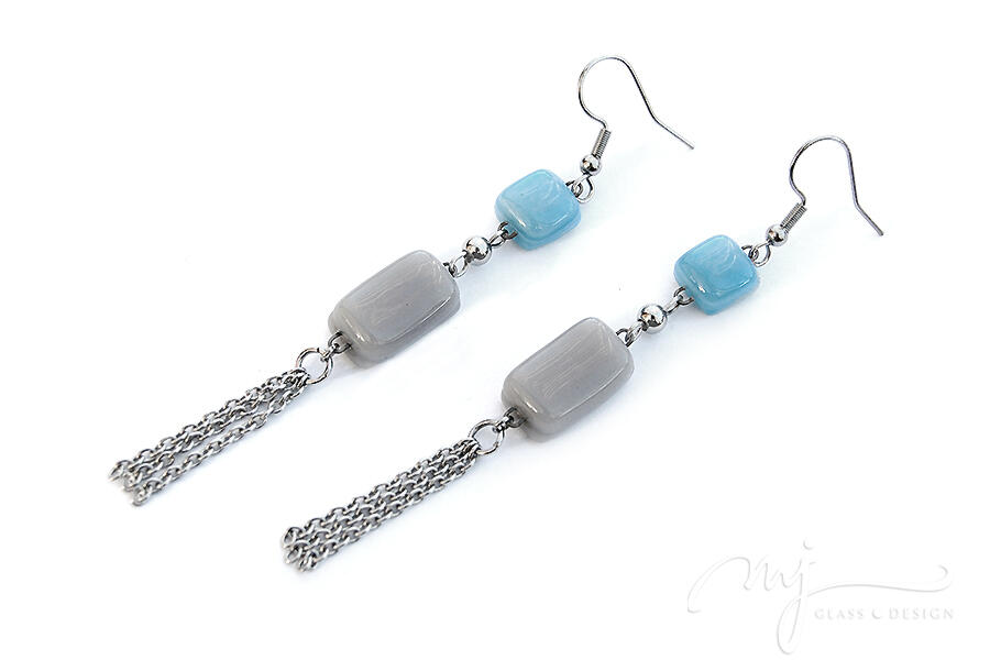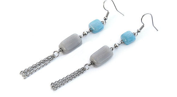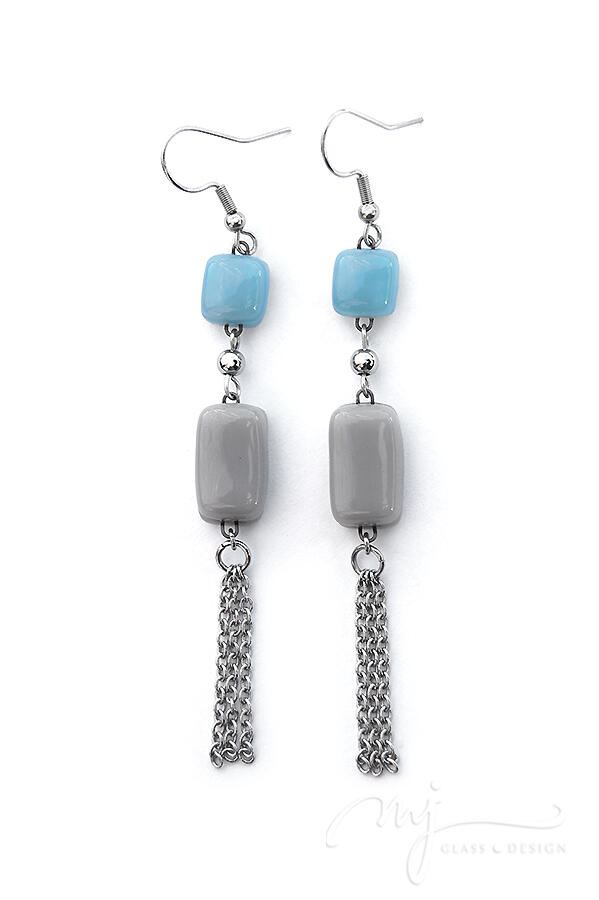 Viharkék és szürke üvegelemekből állítottam össze ezt a lógós fülbevalót. Az üvegdarabokat apró gömbdísszel választottam el egymástól, az alsó elemre függesztett láncrojt pedig remekül kiegészíti az amúgy is játékosan felépített formát.