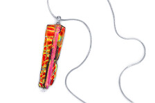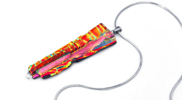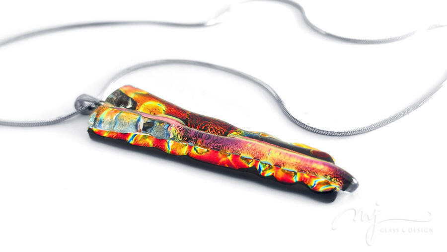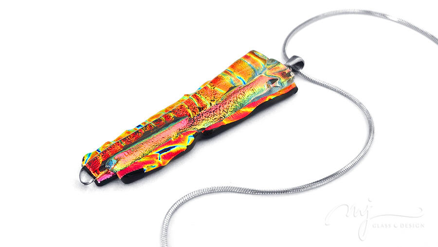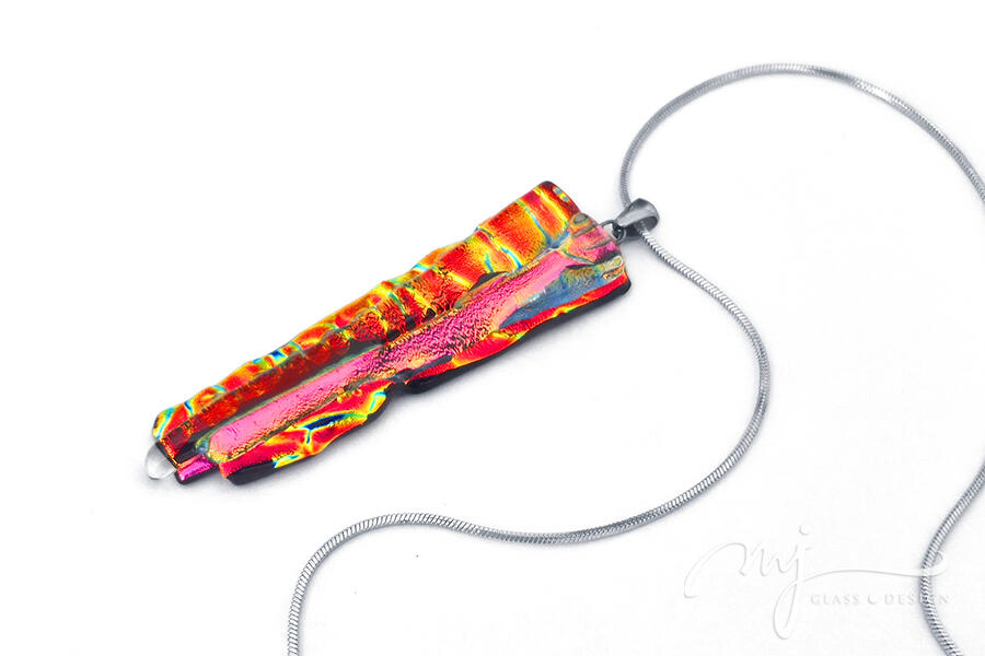 Fényes, élénk tónusokkal telt, cirmos mintázatú tűzpiros, citrom, arany és narancs színekben játszó üveget olvasztottam össze gyönyörű pink színnel, amelyben némi aranyló limezöld árnyalat is megbújik. Az üvegmedált egy 60 cm hosszú, orvosi fém kígyóláncra fűztem fel, amelyhez kb. 4 cm-es hosszabbítóláncot is tartozik.