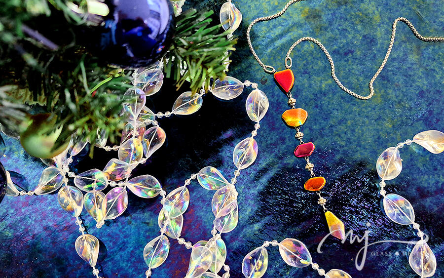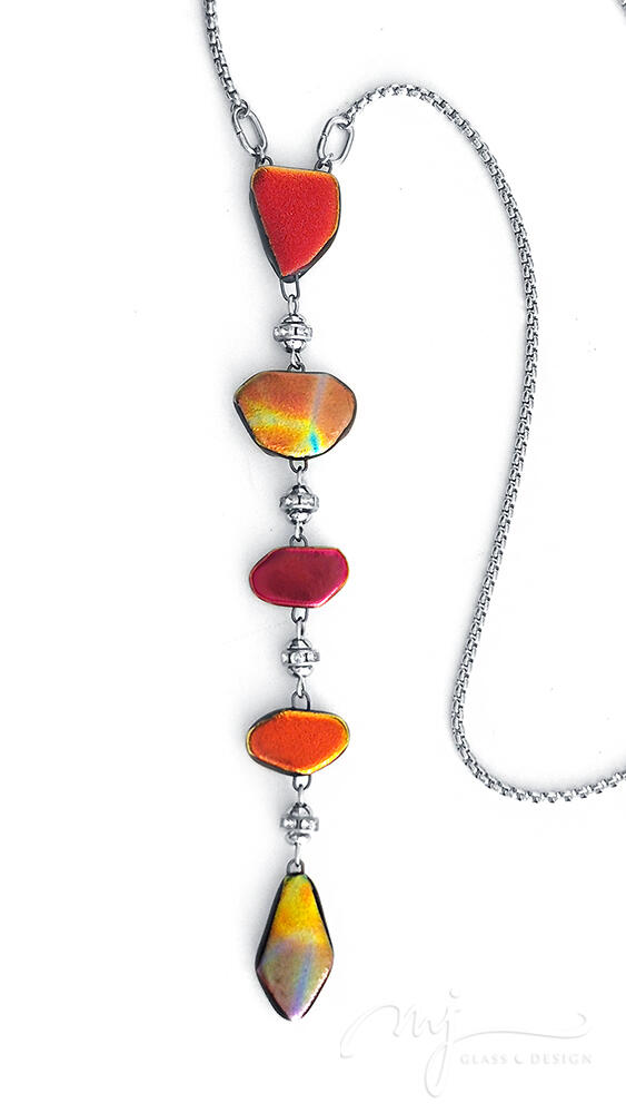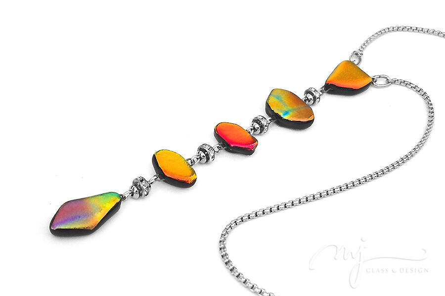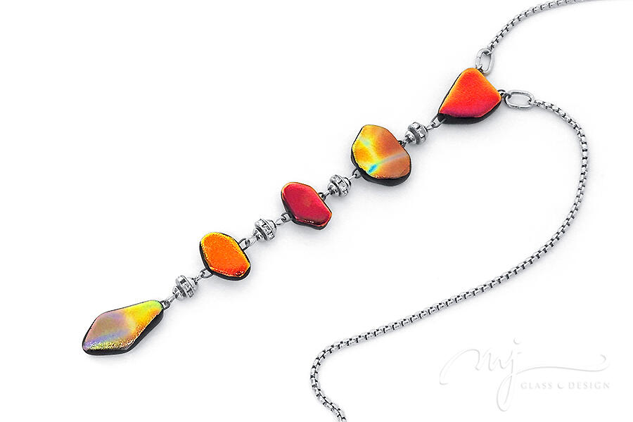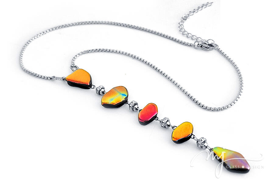 Irizáló, fényes narancssárga, tűzpiros, mély bíbor és cirmos-foltos mintájú bronz üvegekből állítottam össze ezt a magával ragadó, elegáns nyakéket. Az amorf alakzatra kialakított üvegeket strasszokkal kirakott díszítőelemekkel választottam el egymástól, így emelve tovább fényét és különleges karakterét az ékszernek.