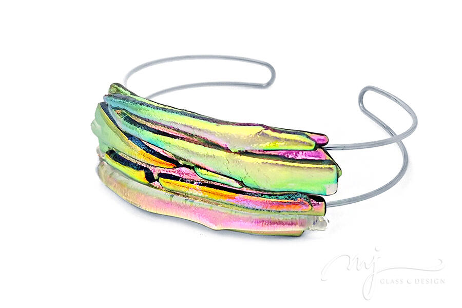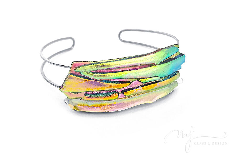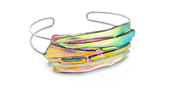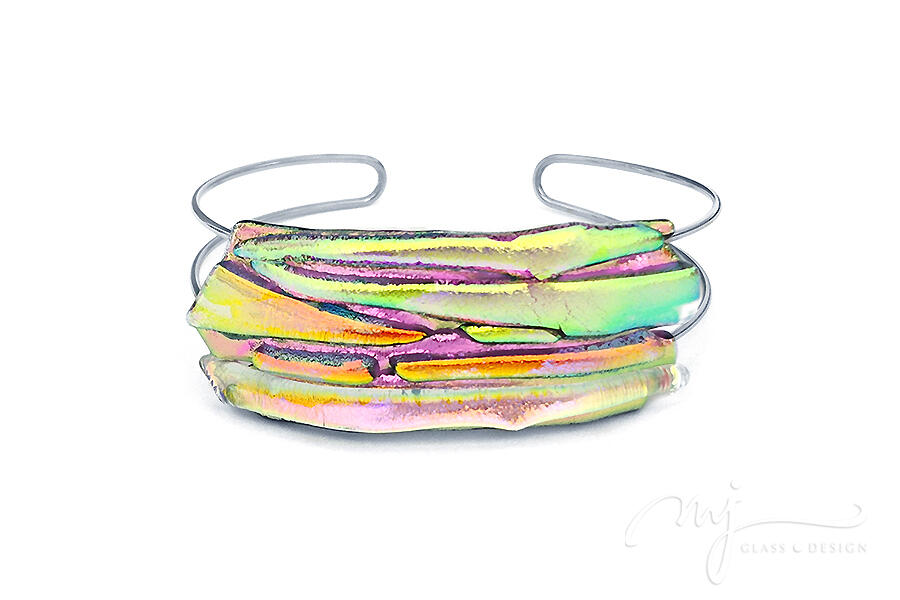 Ez a széles, rétegzett üvegkarkötő olyan, mint egy befagyasztott szivárvány a kézen: az aranyzöld, a pink, a lime és a sárga hologramos árnyalatok egymásba olvadva hoznak létre egy lenyűgöző, soha meg nem ismételhető mintázatot.