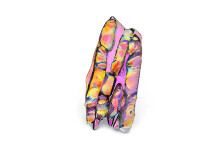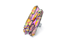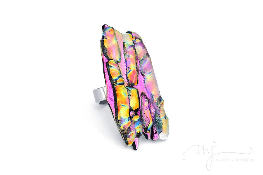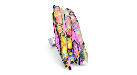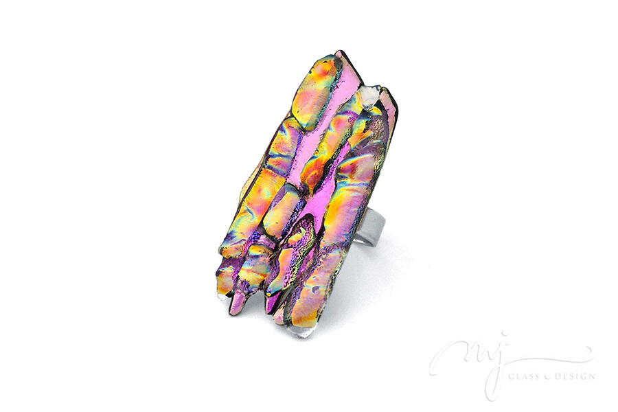 Több réteg szivárványos, irizáló üveget olvasztottam egymásra — a töredezett, sziklaszerű formák merészen magasodnak, miközben pink, arany, türkiz és indigó árnyalatokban is játszik rajtuk a fény. Akár egy viselhető szobor. Tökéletes választás azoknak, akik nem félnek kitűnni a tömegből.