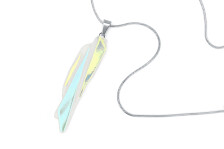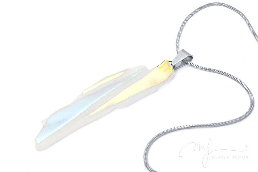 Hófehér, narancs és áttetsző arany színű üveget olvasztottam egy ékszerré, ahol az arany csíkok meleg, napfényes ragyogást kölcsönöznek ennek az elegáns medálnak. Karcsú, letisztult, különleges formája modern és klasszikus viselethez egyaránt tökéletes kísérő.