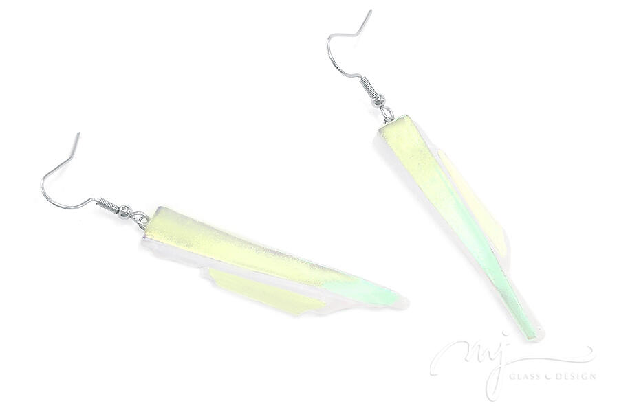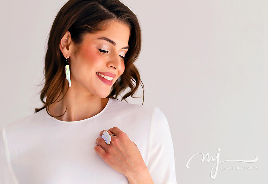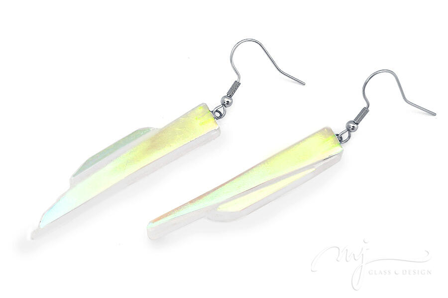 Fehér alapüvegre olvasztottam ezt az áttetsző, szivárványszínű üvegréteget, amely életre kelti az ékszert. A hologramos hatás nem bevonat, hanem maga az anyag játszik a fénnyel, minden szögből más színt villantva. Egyedi, könnyű viselet minden alkalomra – legyen szó egy elegáns estéről vagy a mindennapok hangsúlyozásáról.