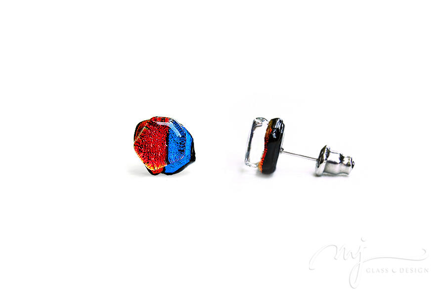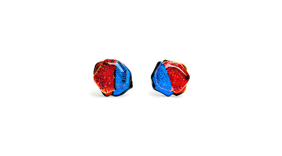 Csillogó azúrkék és élénk, irizáló piros színű üveg kombinációjából készítettem ezt az egyedi, szabad formájú fülbevalót. Szemet gyönyörködtető darab.