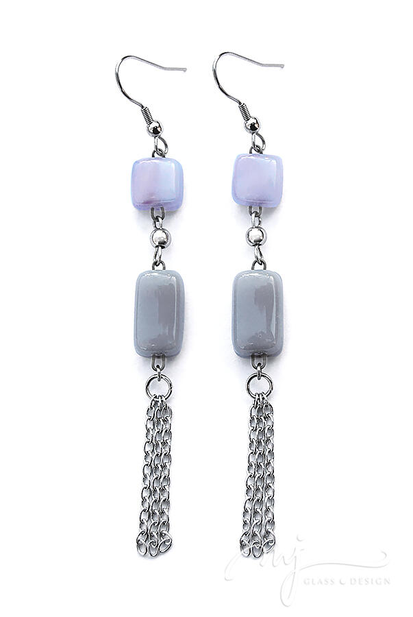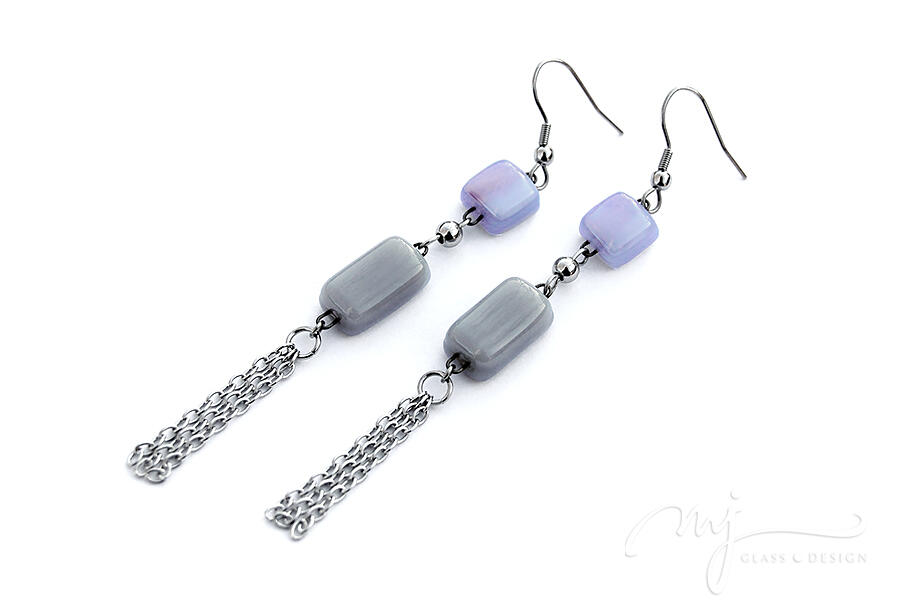 Matt lila és szürke üvegelemekből állítottam össze ezt a lógós fülbevalót. Az üvegdarabokat apró gömbdísszel választottam el egymástól, az alsó elemre függesztett láncrojt pedig remekül kiegészíti az amúgy is játékosan felépített formát.