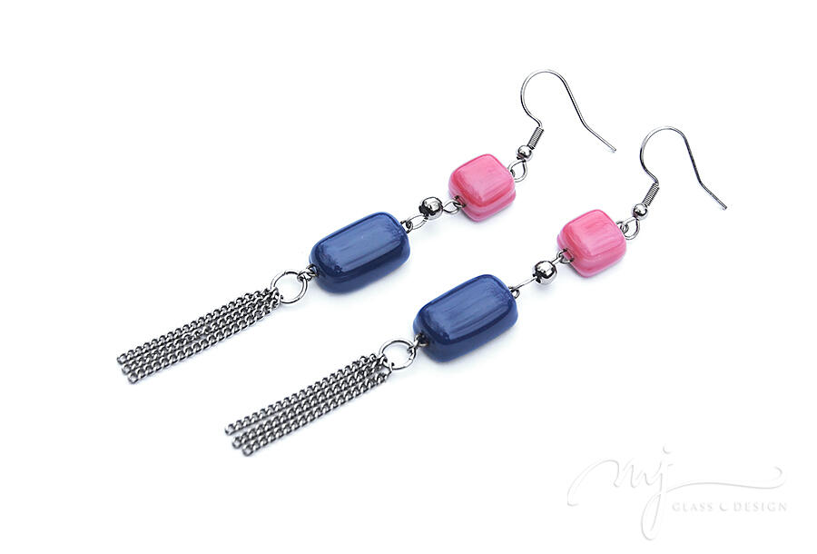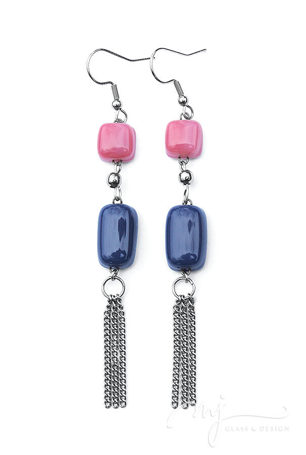 Matt rózsaszín és kobaltkék üvegelemekből állítottam össze ezt a lógós fülbevalót. Az üvegdarabokat apró gömbdísszel választottam el egymástól, az alsó elemre függesztett lánccsokor pedig remekül kiegészíti az amúgy is játékosan felépített formát.