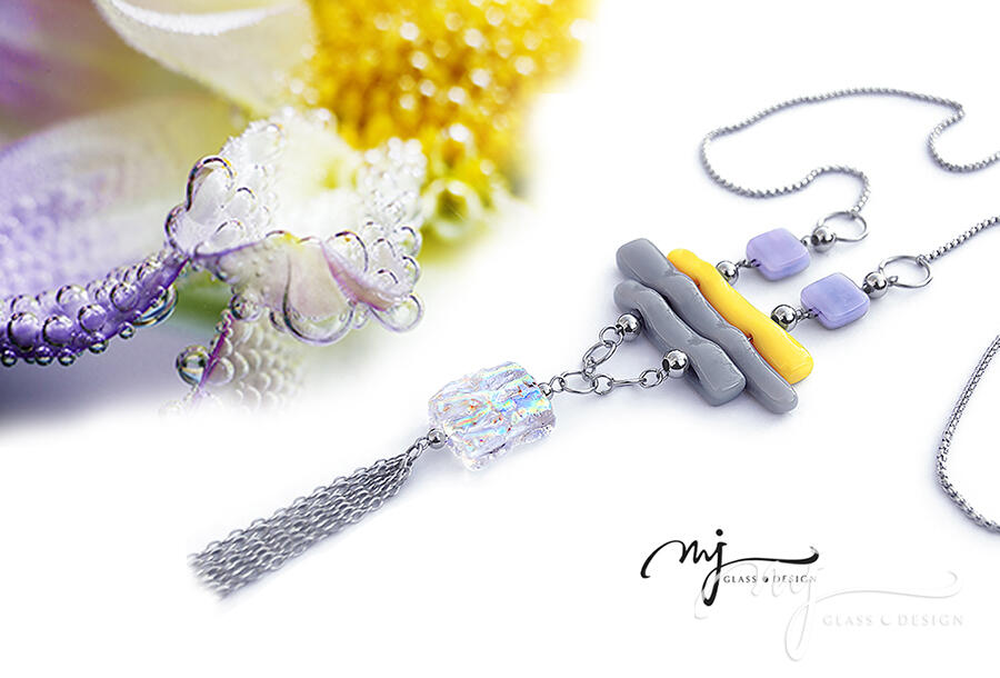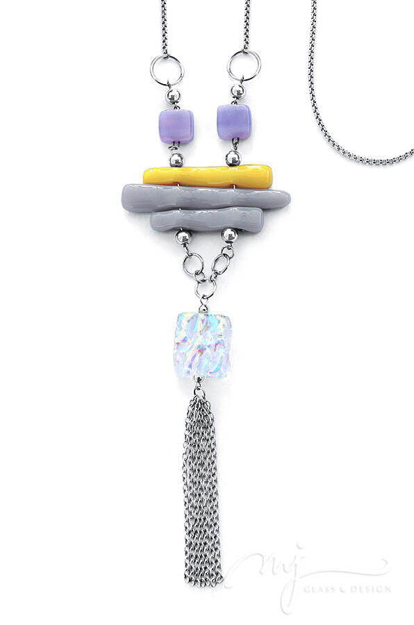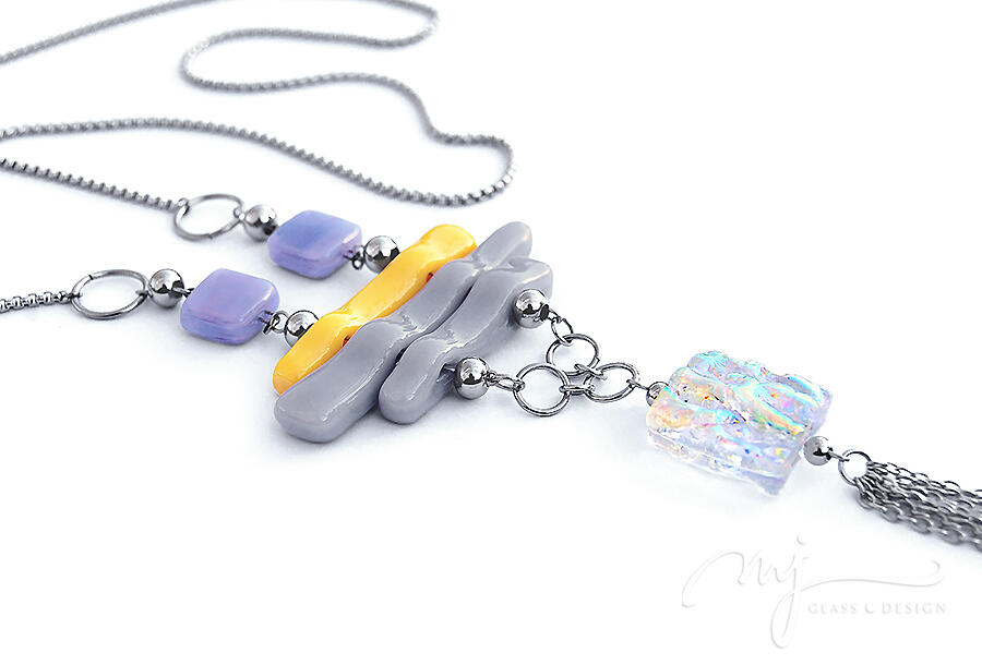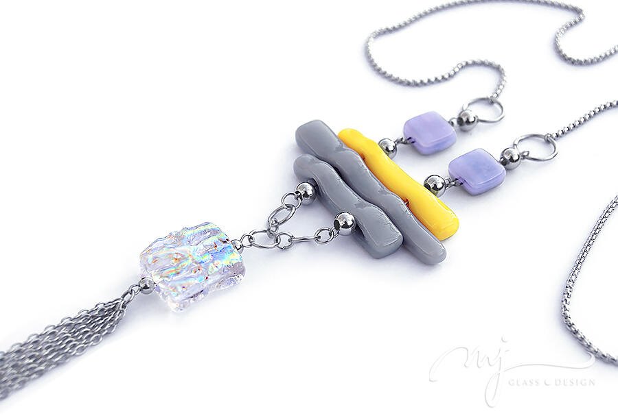 Napsárga, szürke, lila és áttetsző szivárványszínű üvegelemekből állítottam össze a méreteiben és színeiben is harmonizáló medált. Az üvegdarabokat gömbdíszekkel és különböző méretű fémkarikákkal választottam el egymástól, így építve fel a medált, aminek elemei hol fixek, hol játékosan forognak viselés közben, mindig egy újabb arcát mutatva meg így a világnak.