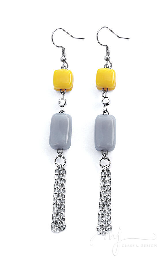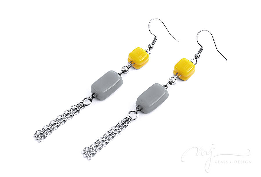 Napsárga és szürke üvegelemekből állítottam össze ezt a lógós fülbevalót. Az üvegdarabokat apró gömbdísszel választottam el egymástól, az alsó elemre függesztett lánccsokor pedig remekül kiegészíti az amúgy is játékosan felépített formát.