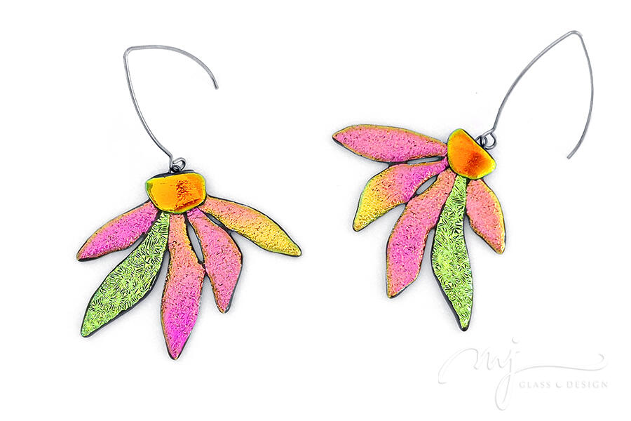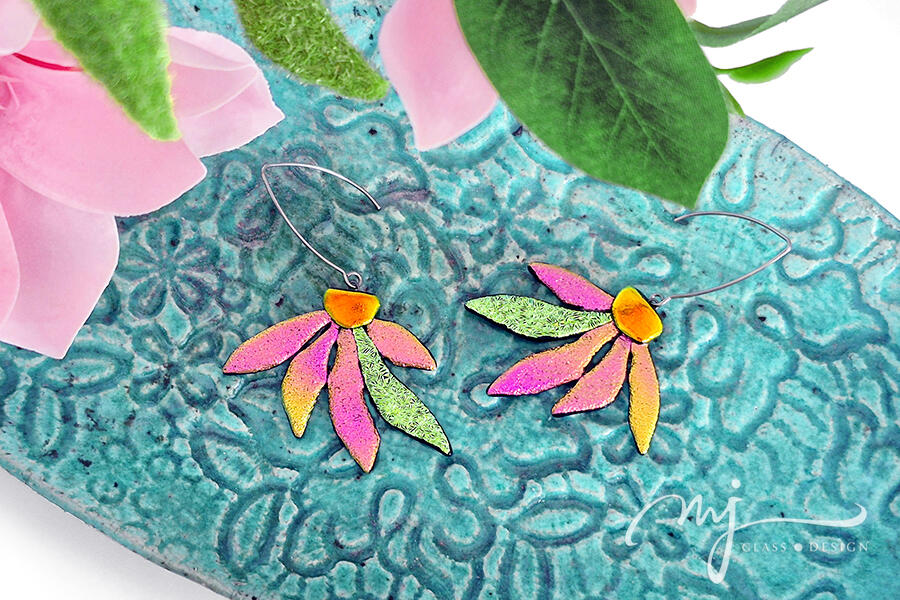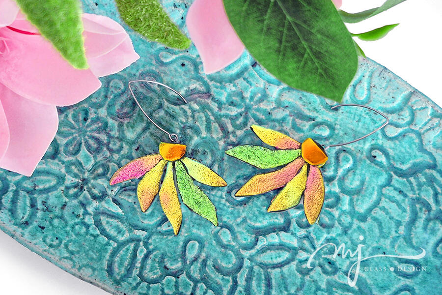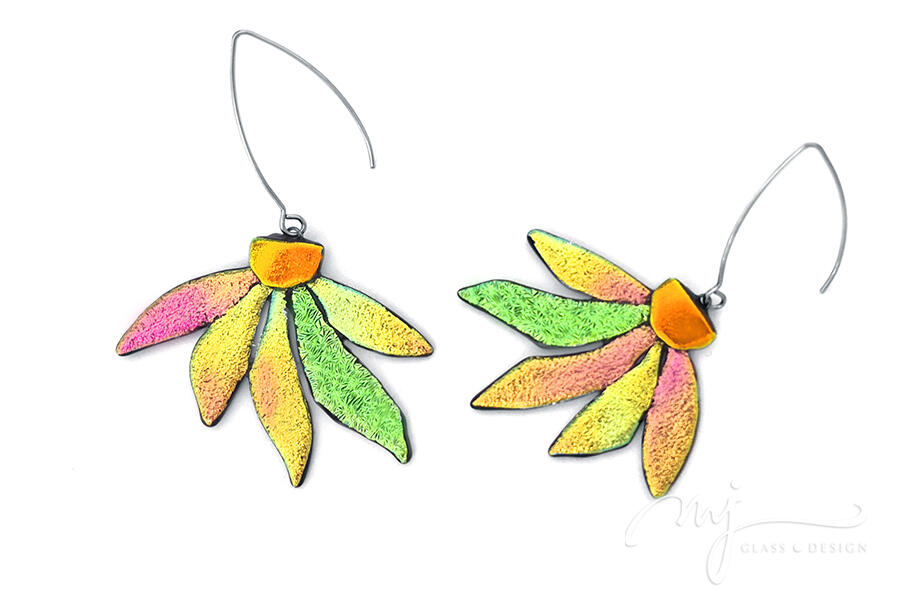 Különleges formavilágú, statement virág született enyhén rusztikus felületű üvegekből válogatva. A narancssárga, pink, lime és aranysárga színekben a virágzó, éledező tavaszt látod és érzed. A virág szirmai, - mint a nap sugarai - szétterülnek és beragyogják az arcot. Szirmai meleg, zöldes aranysárgában és türkizkékben irizálnak.