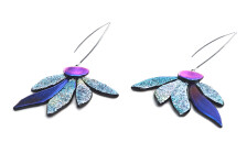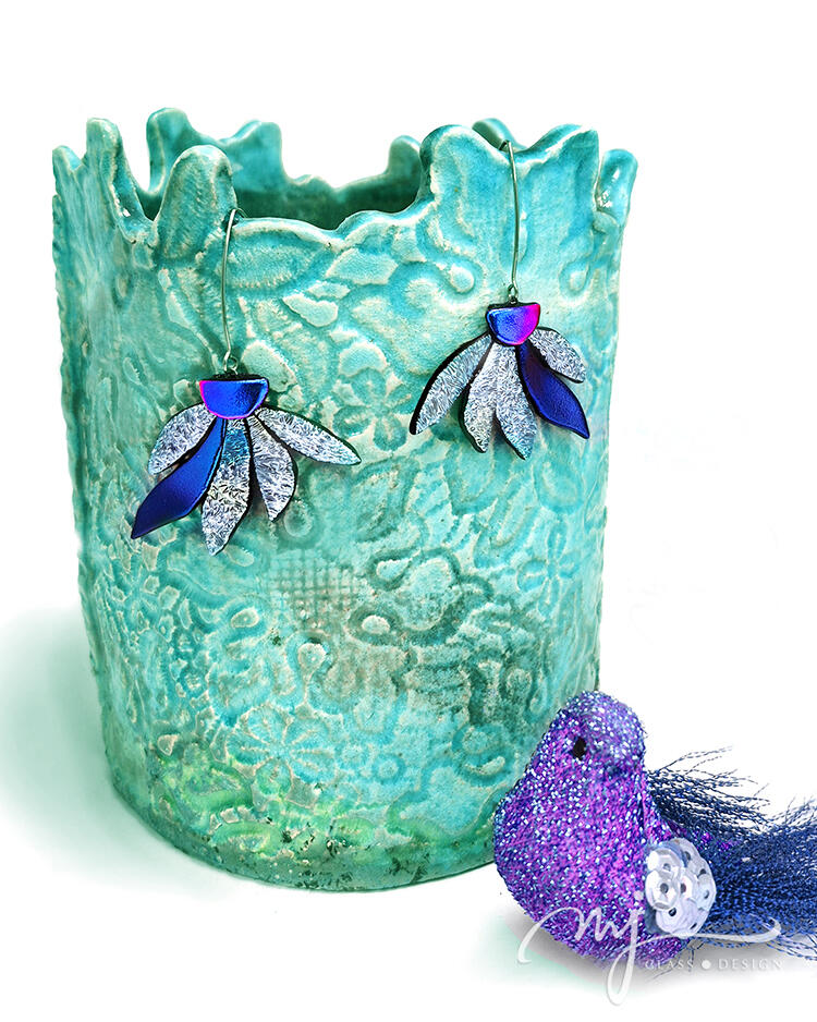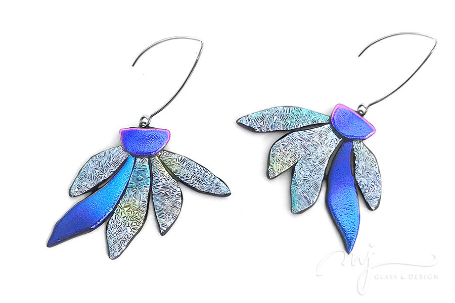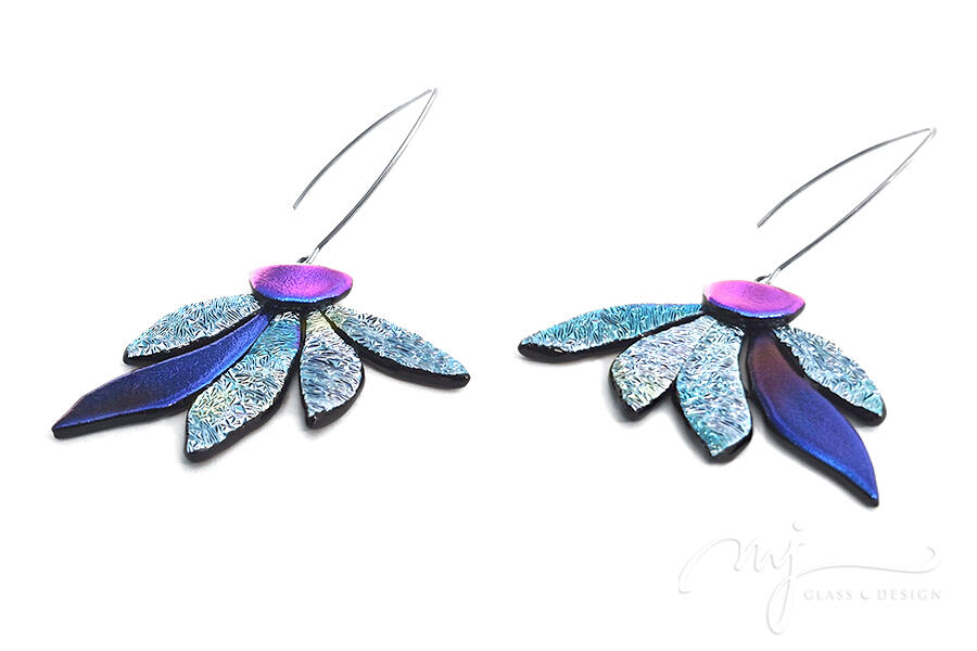 Különleges felületű és mintázatú üvegeket olvasztottam ehhez a csodás virágos fülbevalóhoz. Cirmos mintázatú, rusztikus felületű ezüstös jégkék, átmenetes kék és élénk pinkben irizáló liláskék színek együttese alkotja az ékszer karakterét. Felületén foltokban pezsgős és lilás színt is felfedezhetsz. A virág szirmai, - mint a nap sugarai - szétterülnek és beragyogják az arcot. Fényes szirmai navikékben, indigóban és fuksziában irizálnak.