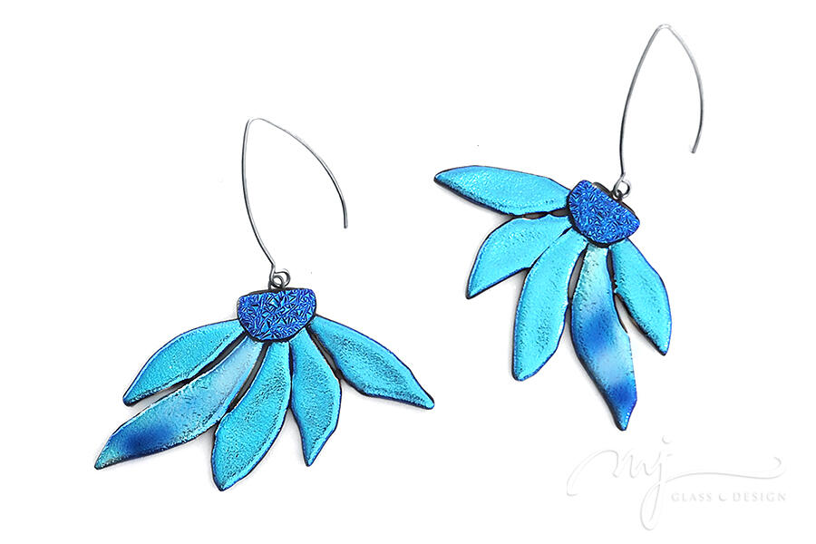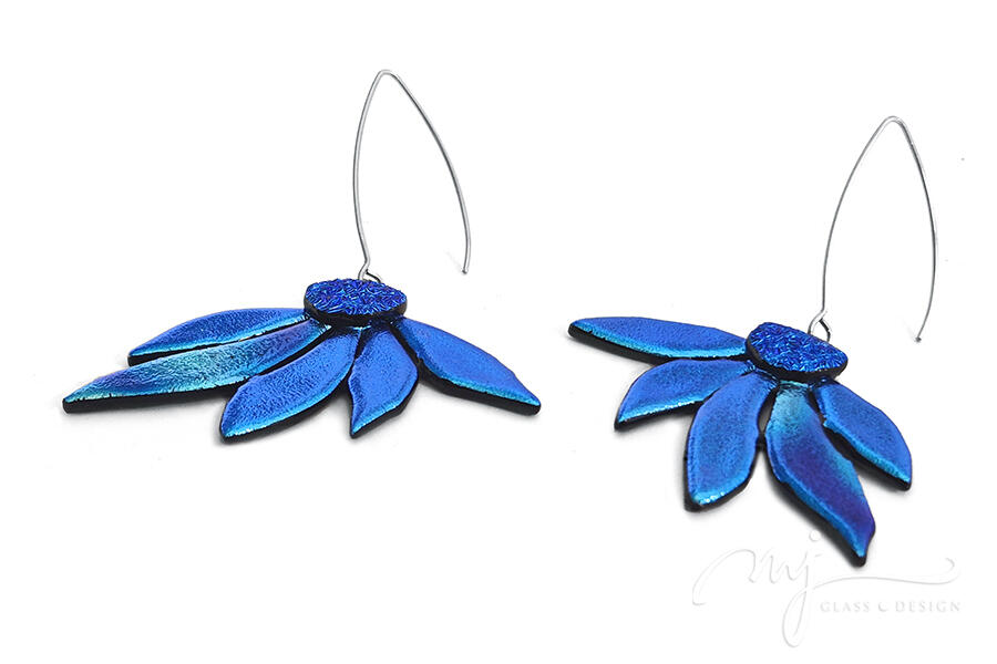 Különleges formavilágú, statement virág született cirmos mintázatú kék, fényes türkiz és rusztikus felületű királykék színekből. A virág szirmai, - mint a nap sugarai - szétterülnek és beragyogják az arcot. Fényes szirmai navikékben és indigólilában is irizálnak.