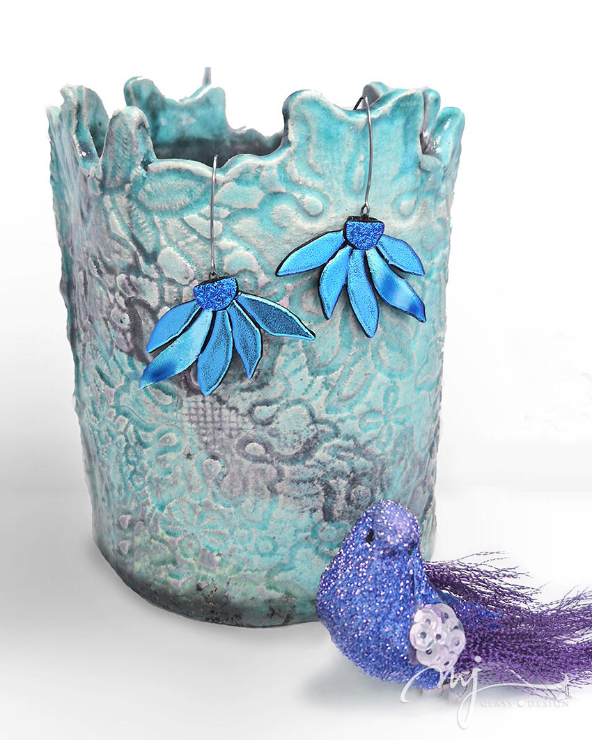 CARNABELLA – cirmos kék, türkiz és rusztikus királykék színű virágos lógós fülbevaló