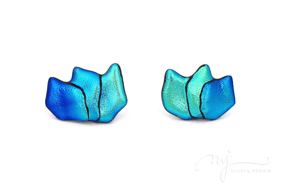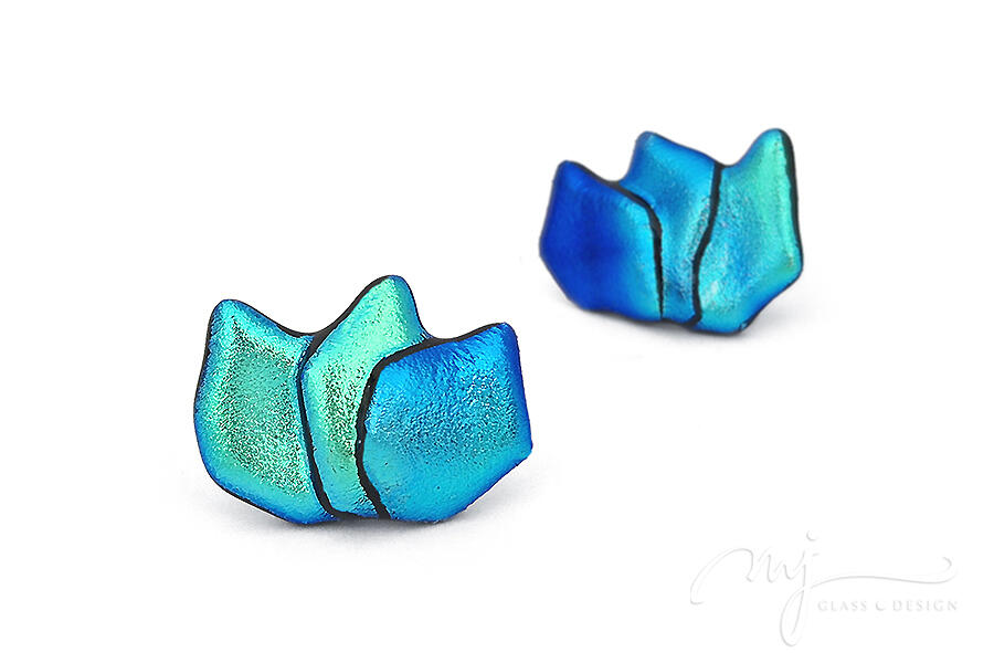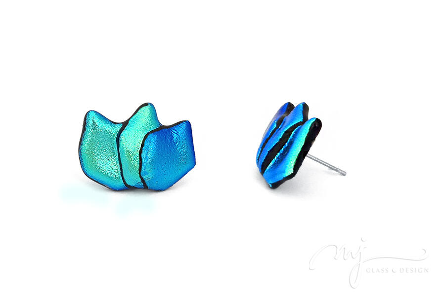 Egymásra hajló virágszirmokat formáztam meg cirmos mintázatú kék  színű üvegeket felhasználva. Az irizáló üvegrészek színében a türkiztől a navikékig minden árnyalat felfedezhető.