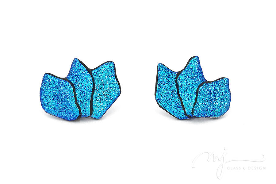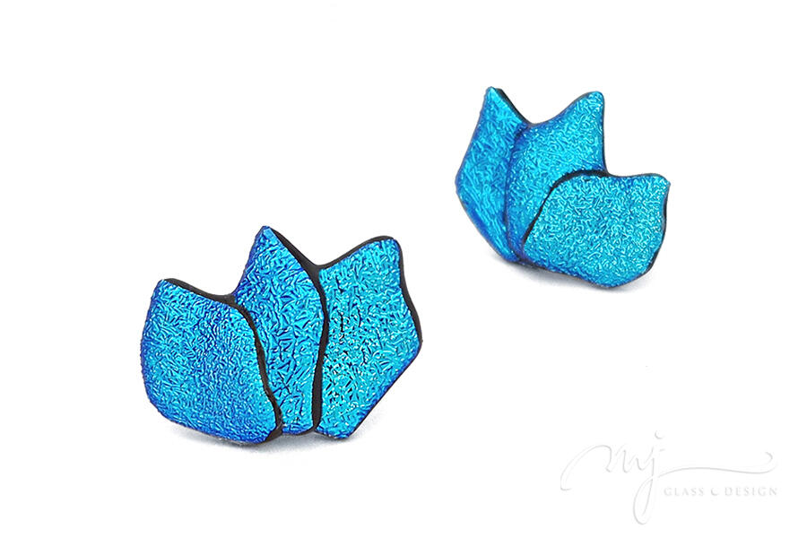 Egymásra hajló virágszirmokat formáztam meg enyhén rusztikus felületű azúrkék színű üvegeket felhasználva. A fülbevaló irizáló felülete indigókékbe hajlik át. Attraktív, látványos és elegáns ékszer lett az eredmény.