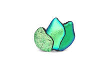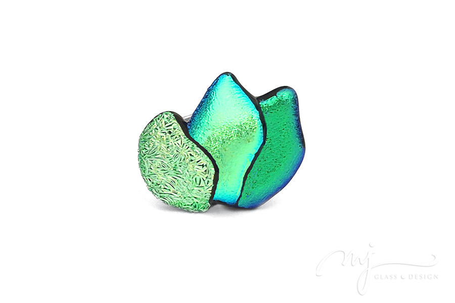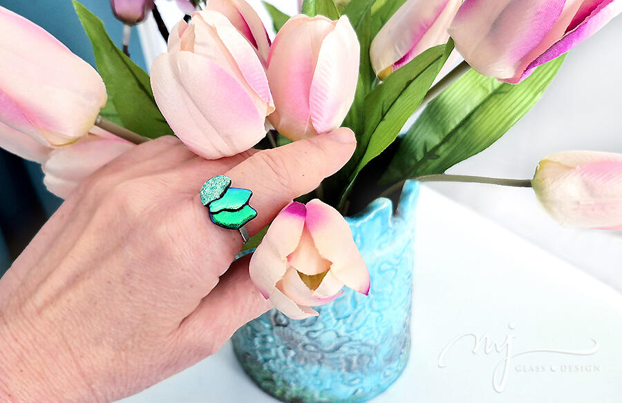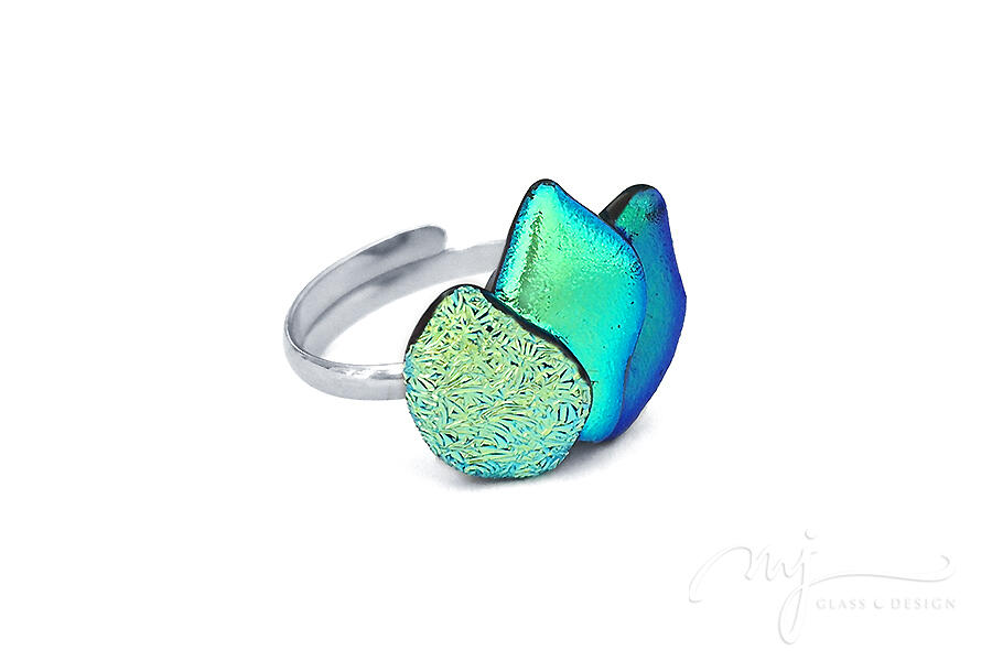 Egymásra hajló virágszirmokat olvasztottam formára, fényes és rusztikus zöld üvegeket felhasználva. Varázslatos tónusok tükröződnek vissza a gyűrű felületén: türkiz- és indigókék, amelyek minden szögből más-más árnyalattal gazdagítják az ékszert.