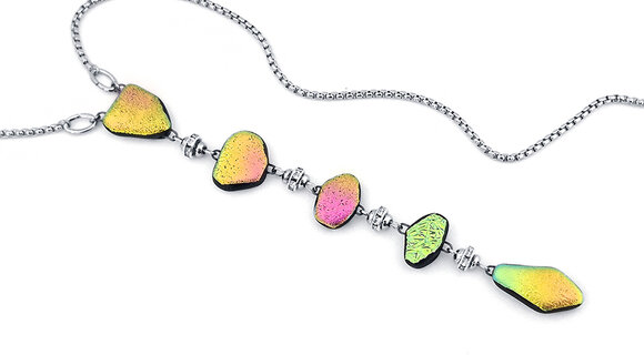 A fusing technikával készült üvegmedálok, nyakláncok és fülbevalók különlegessége magában az alapanyagban rejlik. Az irizáló, szikrázó felületüket a rajtuk lévő fém-oxid rétegnek köszönhetik, ez az, amitől az üvegékszer többarcú lesz. Más-más szögből vagy más fényben nézve különböző színárnyalatokban játszik. Az egyedi üvegékszer sosem lesz unalmas: akárhányszor előveszed, hogy ékesítsd vele magad, mindig rácsodálkozhatsz egy újabb megjelenésére.