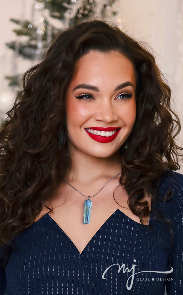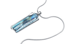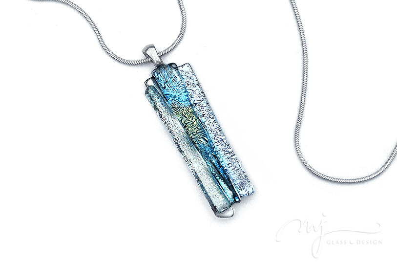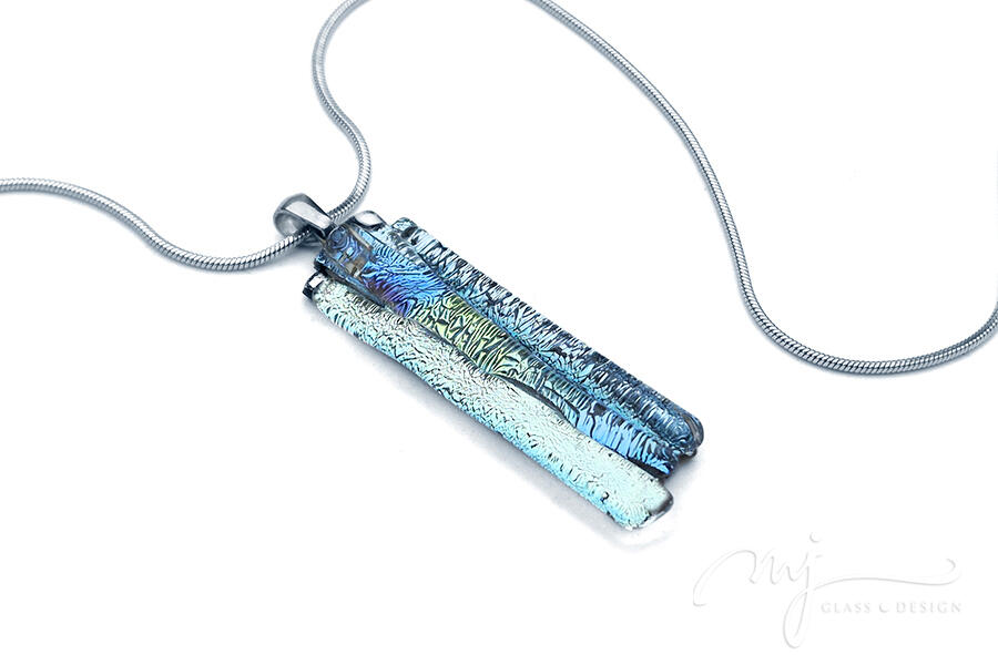 Cirmos mintázatú, irizáló, pezsgős árnyalattal gazdagított jégkék üveget olvasztottam össze kétféle ezüstös elemmel. A medál - oldalról nézve - türkizben és indigókékben is irizál. Az üvegmedált egy 42 cm hosszú, orvosi fém kígyóláncra fűztem fel, amelyhez kb. 4 cm-es hosszabbítóláncot is tartozik.