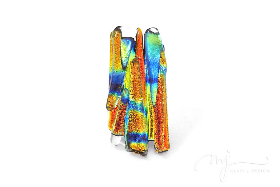 Élénk, fényes árnyalatokkal telt, cirmos mintázatú narancssárga, király- és indigókék, citromsárga és türkiz színekben játszó üveget olvasztottam téglalap alakzatra, amelyben némi indigókék árnyalat is megbújik.