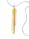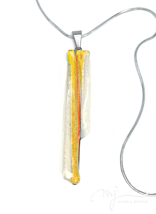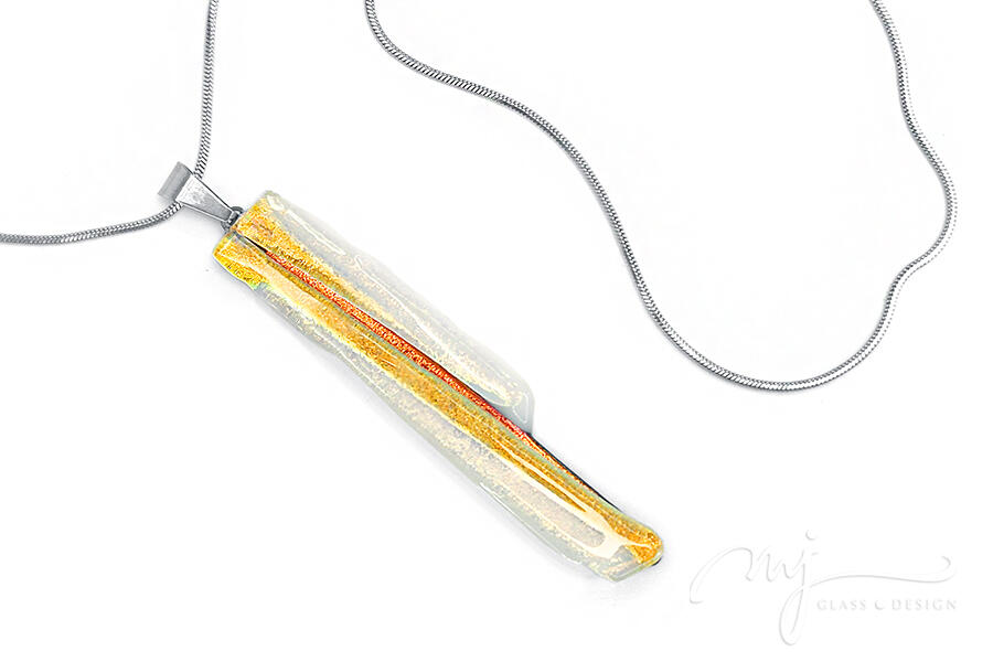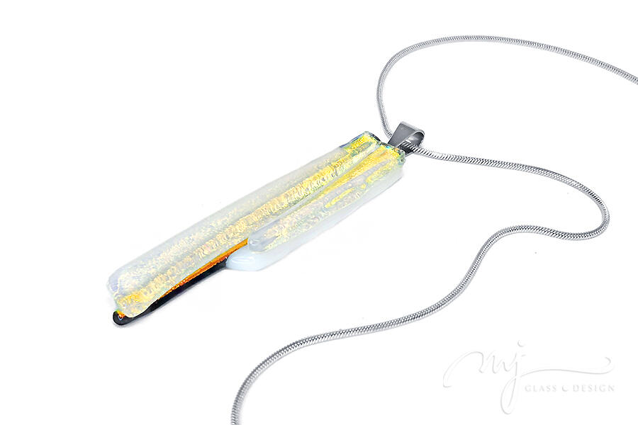 Hófehér, narancs és áttetsző arany színű üveget olvasztottam egy ékszerré, ahol az arany csíkok meleg, napfényes ragyogást kölcsönöznek ennek az elegáns medálnak. Karcsú, letisztult, különleges formája modern és klasszikus viselethez egyaránt tökéletes kísérő.