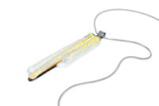 Az üvegmedált hosszított alakzatra olvasztottam, amit egy 58 cm hosszú, orvosi fém kígyóláncra fűztem fel. A hozzácsatolt hosszabbítólánc hossza kb. 4 cm.