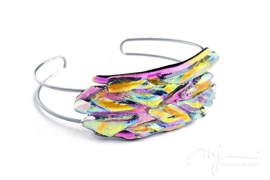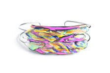 Ezt a nem mindennapi karkötőt a hullámos, rétegzett üvegfelület jellemzi és gyönyörű, megunhatatlan színvilága, amely minden mozdulatnál más-más irizálást mutat — hol melegarany, hol hideg türkiz, hol mély indigó villan elő a pink alapból.