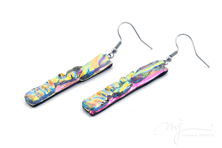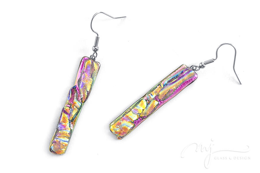 A fülbevaló élénk pink alapüvegén lenyűgöző szivárványjátékot fedezhetsz fel. A rusztikus, hullámos felületű üvegek mozgás közben arany, türkiz, lila és korall árnyalatokat villantanak fel. A karcsú, megnyúlt forma könnyed eleganciát kölcsönöz a viseletnek, miközben az irizálás garantáltan magához vonzza a tekinteteket.