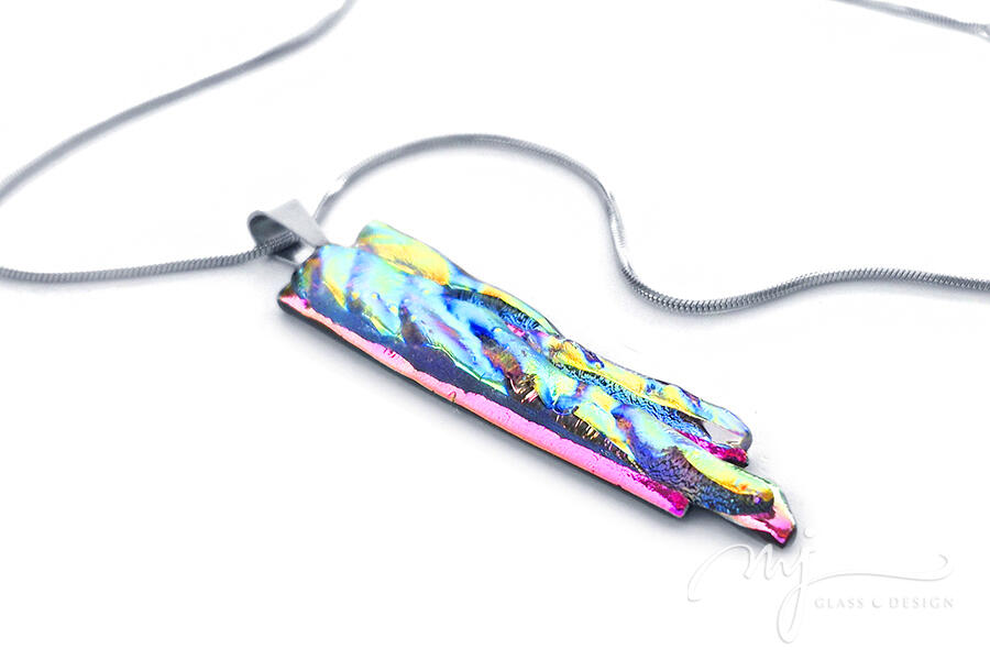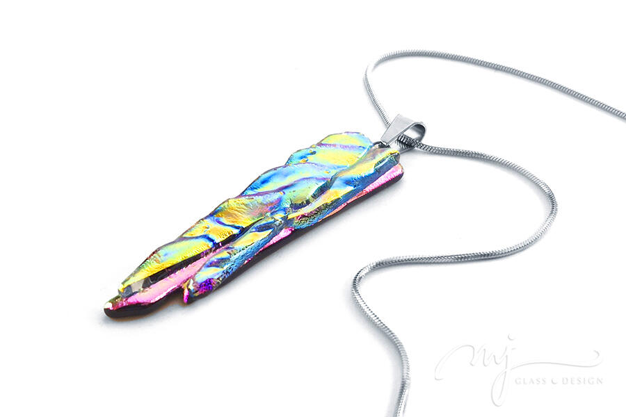 Élénk, fénylő pink üvegalapra hullámos felületű, szivárványszínű üveget olvasztottam — az így létrejövő irizálás minden fényszögből más-más árnyalatot villant fel: indigó, arany, türkiz és korall váltakozik egymással. A karcsú, sziklahasadékra emlékeztető forma egyszerre nyers és elegáns. Minden részlete különleges, pontosan olyan, mint a fény, amely megeleveníti.