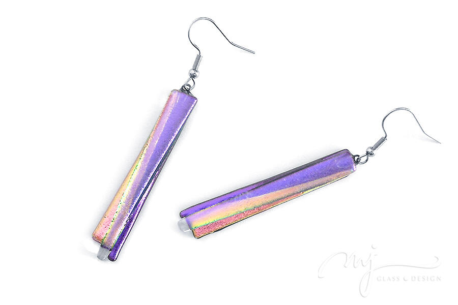 Karcsú, elegáns fülbevaló született, ahol az irizáló lila és pasztellrózsaszín üveg aranyfényű játéka minden lépésnél megcsillan, finoman ringatózva az arc mellett. Az áttetsző lila fedőüveg lágy mélységet kölcsönöz a darabnak, amely egyszerre nőies és modern.