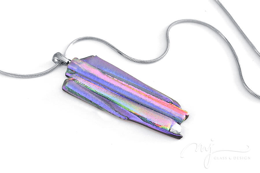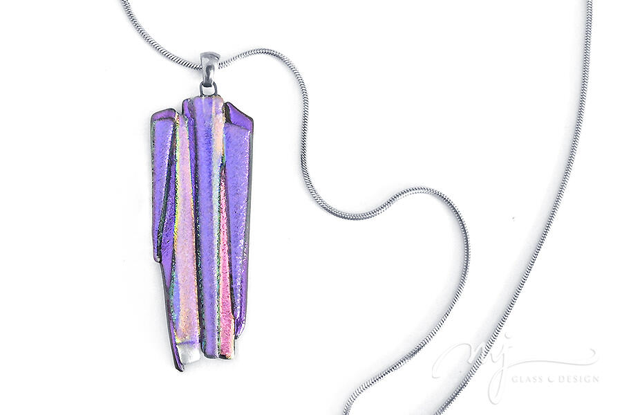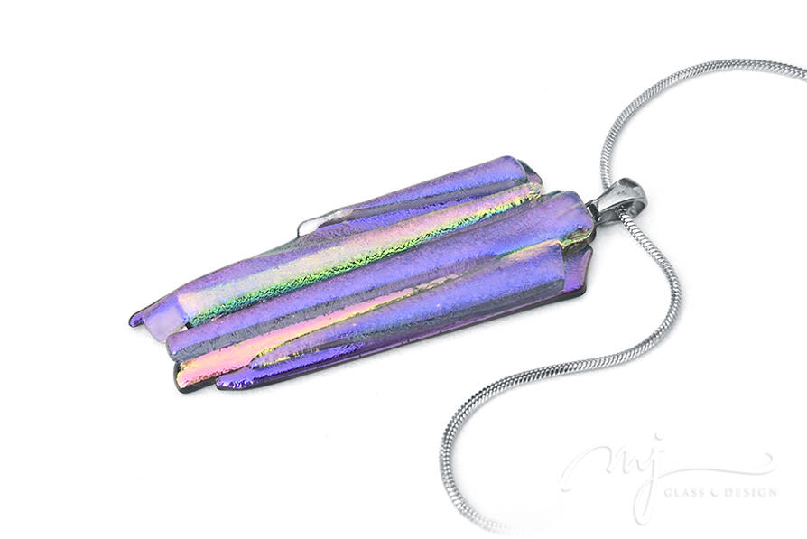 Az irizáló lila és pasztellrózsaszín üveg aranyfényű csillogással szőtt kompozíciója egy igazi fényjáték – a tetejére olvasztott áttetsző lila üveg pedig selymes mélységet ad a medálnak, amely minden outfitet különlegessé varázsol.