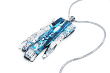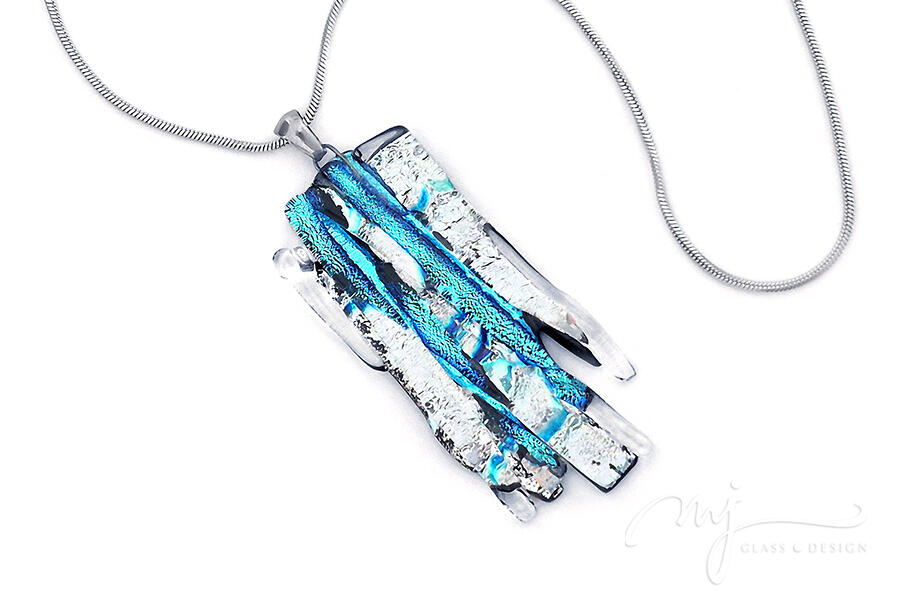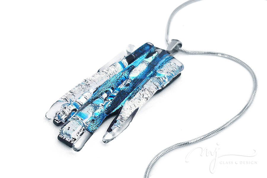 Türkizkék mintás, fényes ezüst, élénk türkiz és hideg jégkék üvegeket olvasztottam össze, amelyben a sötétebb királykék és indigó árnyalat is felfedezhető. A medál enyhén hullámos felületű, így még izgalmasabbá válik, ahogy felületén megtörik a fény.