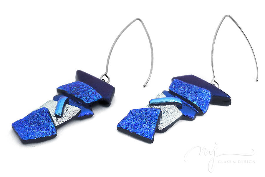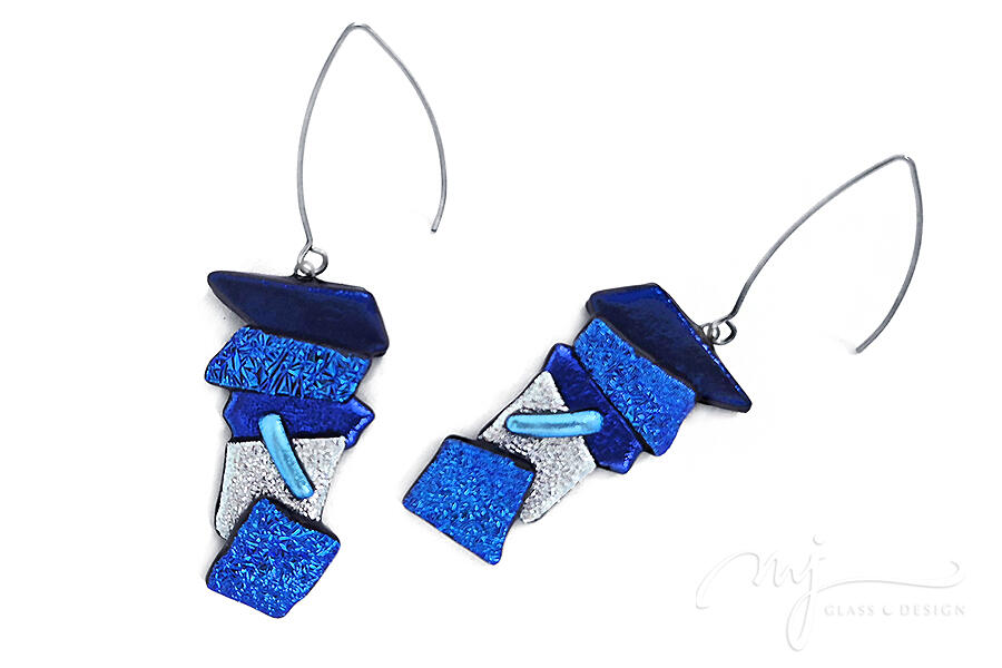 Irizáló, különböző formájú üvegelemekből építettem fel és olvasztottam egy egésszé ezt a lógós fülbevalót, amelyben rusztikus ezüst és királykék üvegek találkoznak az indigókék, türkiz és zafírkék színekkel. Igazi színkavalkád lett a végeredmény, mégis gyönyörűen megférnek a különböző formák és árnyalatok együtt. Az üvegek játéka oldalról nézve igazán pazar: azúrkék, türkiz és szinte fekete matrózkék tónusokban ragyogtatják ezt a pazar üvegfülbevalót.