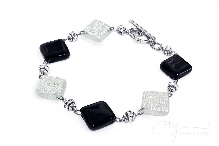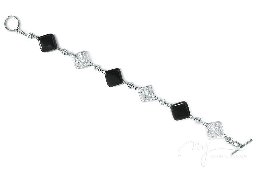 Négyzetes formájú üvegelemekből építettem fel ezt a gyönyörű karkötőt. Fényes, ébenfekete és rusztikus felületű, szinte fehérnek ható ezüstös üvegmozaikok váltogatják egymást, amiket csillogó strasszokkal kirakott köztessel választottam el egymástól, ezzel is emelve az üvegékszer elegáns karakterét.