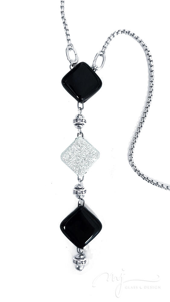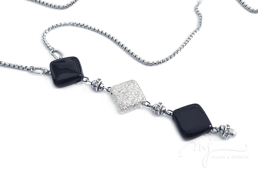 Négyzetes formájú üvegelemekből építettem fel ezt a gyönyörű nyakéket. A fényes, ébenfekete üvegek közé egy izgalmas, rusztikus felületű, szinte fehérnek ható ezüstös üveget építettem. A mozaikokat csillogó gyöngy köztessel választottam el egymástól, ezzel is emelve a nyakék elegáns hatását.