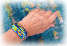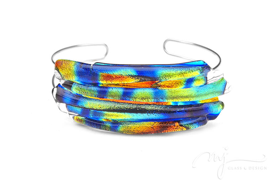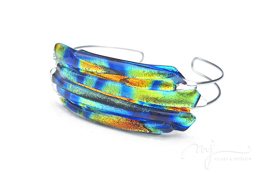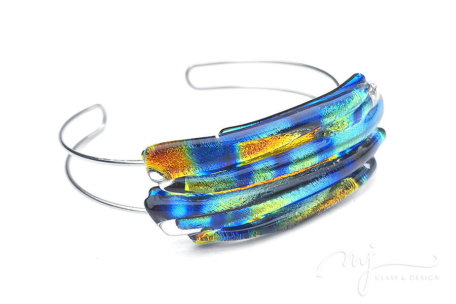 Nem mindennapi, gyönyörű karkötőt készítettem, amelynél úgy alakítottam ki és hajlítottam meg az üveget, hogy lágyan kövesse a csukló vonalát. Fényes, cirmos mintázatú, irizáló narancssárga, királykék, citromsárga, lime és türkiz színekben játszó üvegeket olvasztottam össze egy dekoratív és különleges ékszerré.