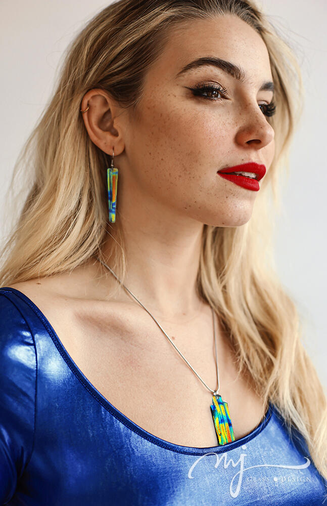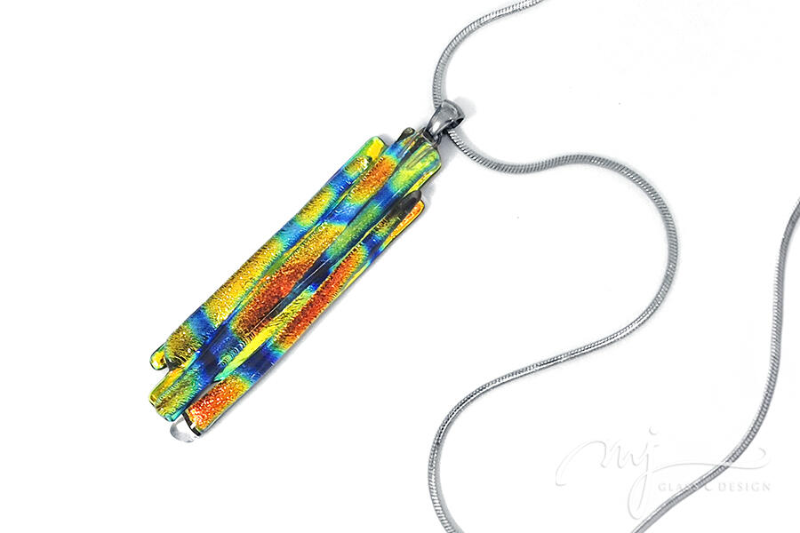 Fényes, élénk tónusokkal telt, cirmos mintázatú narancs, királykék, citromsárga és türkiz színekben játszó üveget olvasztottam téglalap alakzatra, amelyben némi indigókék árnyalat is megbújik. Az üvegmedált egy 50 cm hosszú, orvosi fém kígyóláncra fűztem fel, amelyhez kb. 4 cm-es hosszabbítóláncot is tartozik.