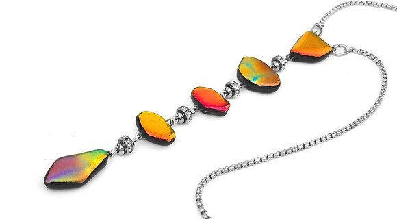 A fusing technikával készült üvegmedálok, nyakláncok és fülbevalók különlegessége magában az alapanyagban rejlik. Az irizáló, szikrázó felületüket a rajtuk lévő fém-oxid rétegnek köszönhetik, ez az, amitől az üvegékszer többarcú lesz. Más-más szögből vagy más fényben nézve különböző színárnyalatokban játszik. Az egyedi üvegékszer sosem lesz unalmas: akárhányszor előveszed, hogy ékesítsd vele magad, mindig rácsodálkozhatsz egy újabb megjelenésére.