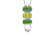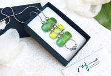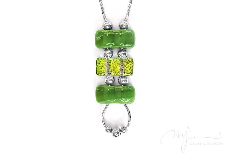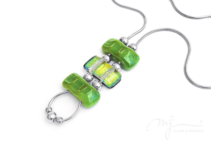 A két élénk fűzöld üveg közé fűztem fel azt az irizáló, aranysárga üveget, amiben a citromsárga és a türkiz árnyalatait is felfedezheted. A lánc alján a három kis nemesacél gömb mozgó díszek, amik egy kis játékosságot is kölcsönöznek a nyaklánc viselése közben.