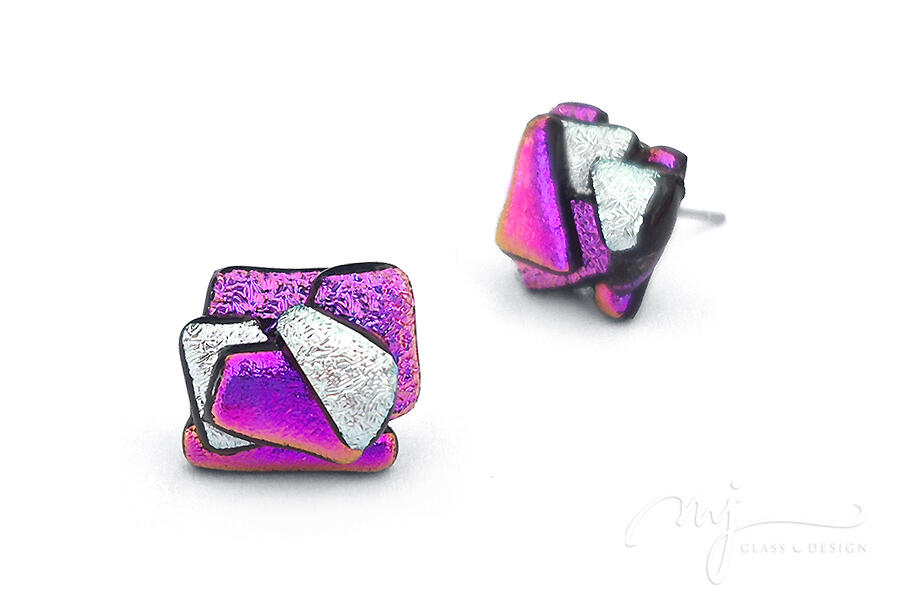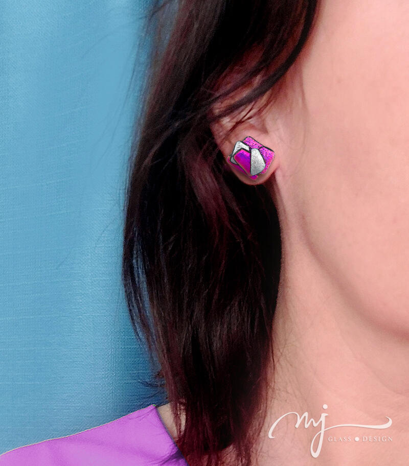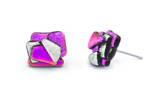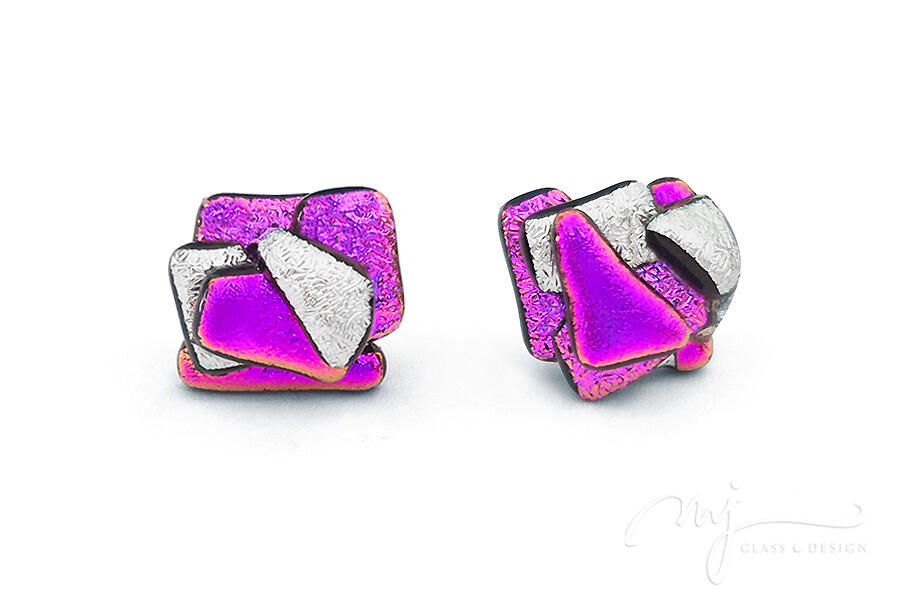 Színjátszó, különböző formájú, élénk árnyalatú pink, lilába hajló fukszia és hideg ezüst színű üvegelemekből építettem fel és olvasztottam egy egésszé ezt a gyönyörű bedugós fülbevalót. Az üvegek irizáló tulajdonságainak köszönhetően - az ékszert oldalról nézve - aranyló lime és türkizkék színeket is felfedezhetsz.