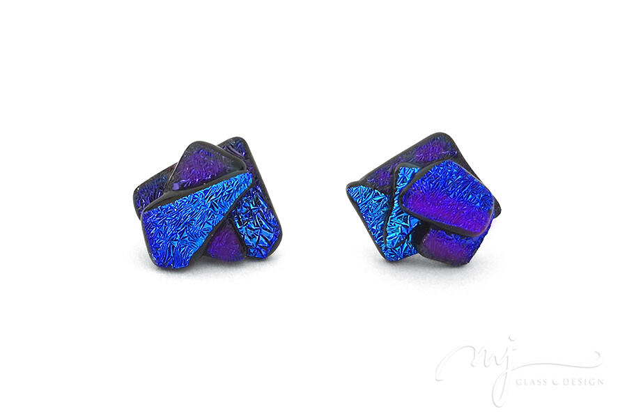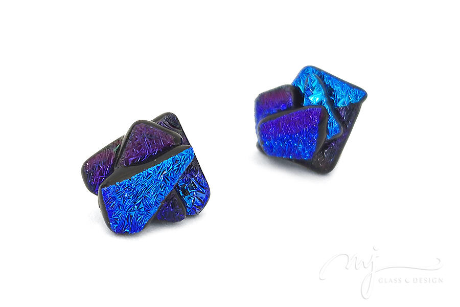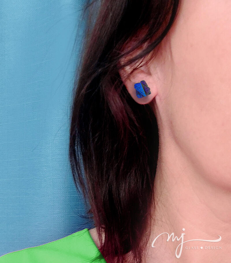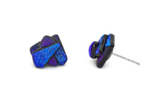 Irizáló, különböző formájú üvegelemekből építettem fel és olvasztottam egy egésszé ezt a csodás bedugós fülbevalót, amelyben az enyhén rusztikus felületű, fényes azúrkék, a lilába hajló királykék színű üvegmozaikok találkoznak a fényes fekete alapszínnel. Méreténél fogva nem hangsúlyos darab, annál inkább a színeit tekintve. Nem maradsz észrevétlen, ez egészen biztos!