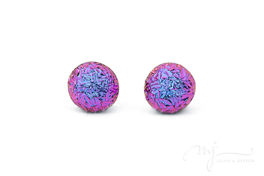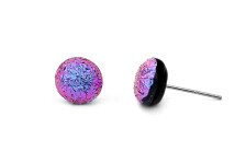 A félgömb bedugós fülbevaló alapszíne élénk pink, de ragyogó lilát is felfedezhetsz benne. Egyediségét az üveg felületéből kissé kiemelkedő karcok adják, ami rusztikus felületet ad az ékszernek.