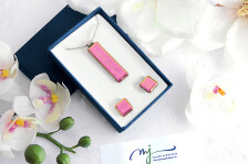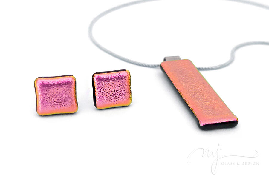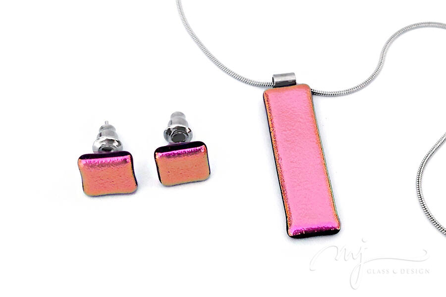 A medál és a fülbevaló lágy, meleg pink színben tündököl, amelyet az üveg gyönyörű, aranyos irizálása hangsúlyoz ki csodásan.
