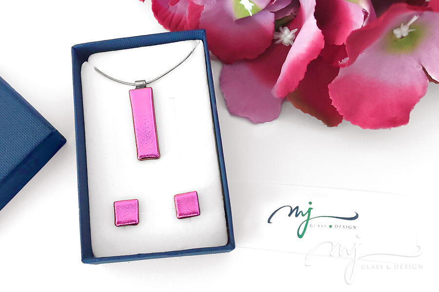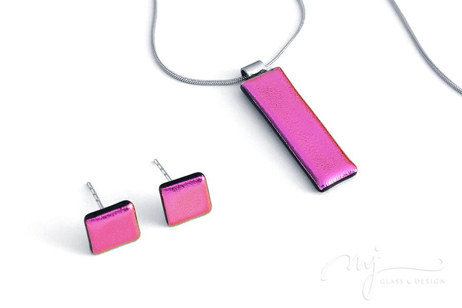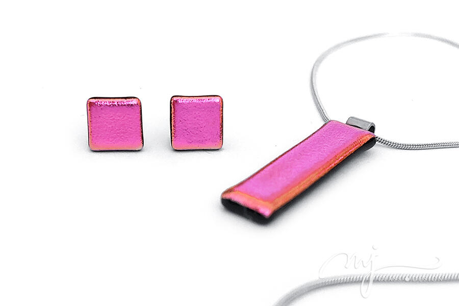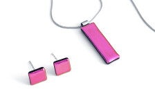 A medál és a fülbevaló élénk, fényes fuksziaszínben játszik, felületén felfedezhetsz egy kevés aranysárga tónust is.