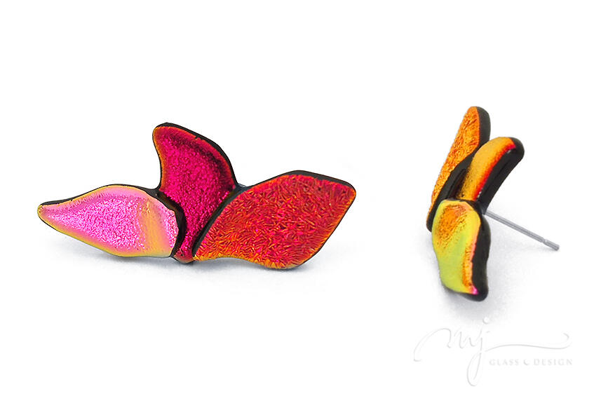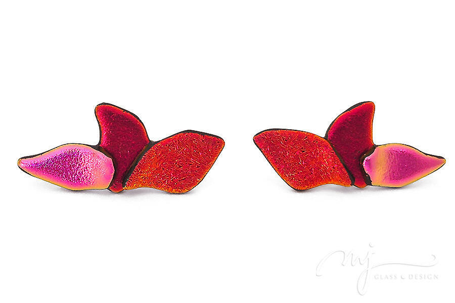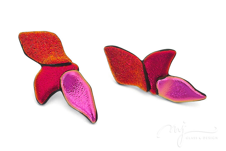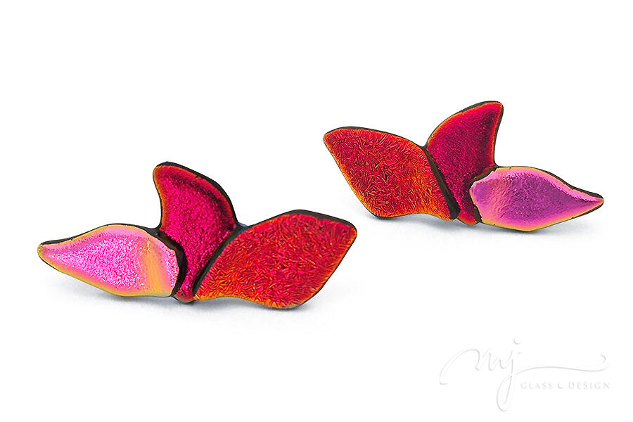 A pillangó légies, finoman kecses szárnyait jelenítettem meg irizáló, rusztikus felületű piros, mély árnyalatú bíbor és élénk pink színű irizáló üvegeket felhasználva. Oldalról nézve csodás harmóniában irizál a három szín: a piros narancsban, a bíbor szín vörösben, míg a pink zöldes aranyban.